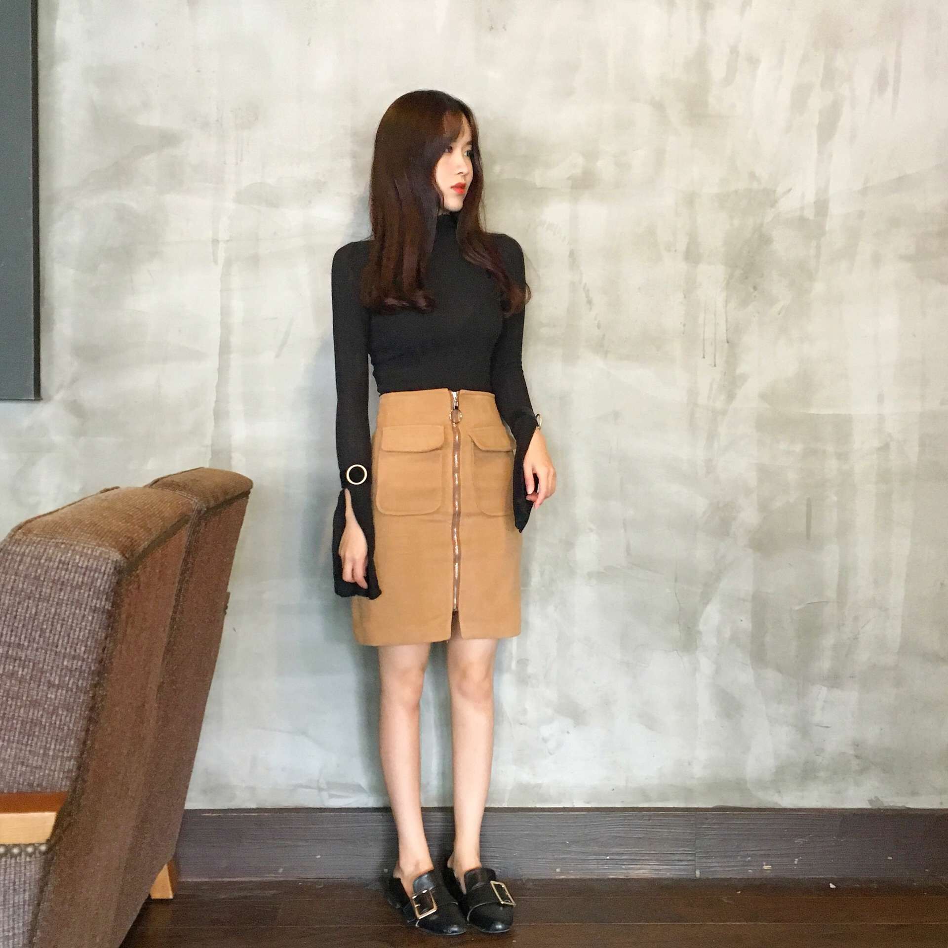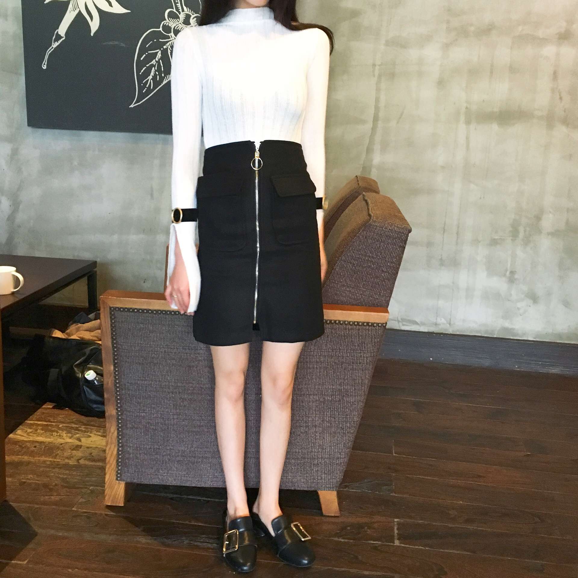 韓國chic秋冬毛呢雙口袋拉鏈圓環設計款顯瘦包臀半身裙中裙女