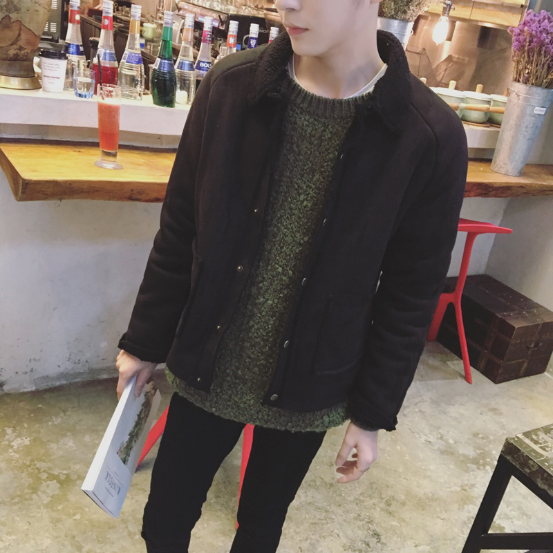 新款男裝韓版修身羊羔毛翻領男士保暖短款棉衣外套