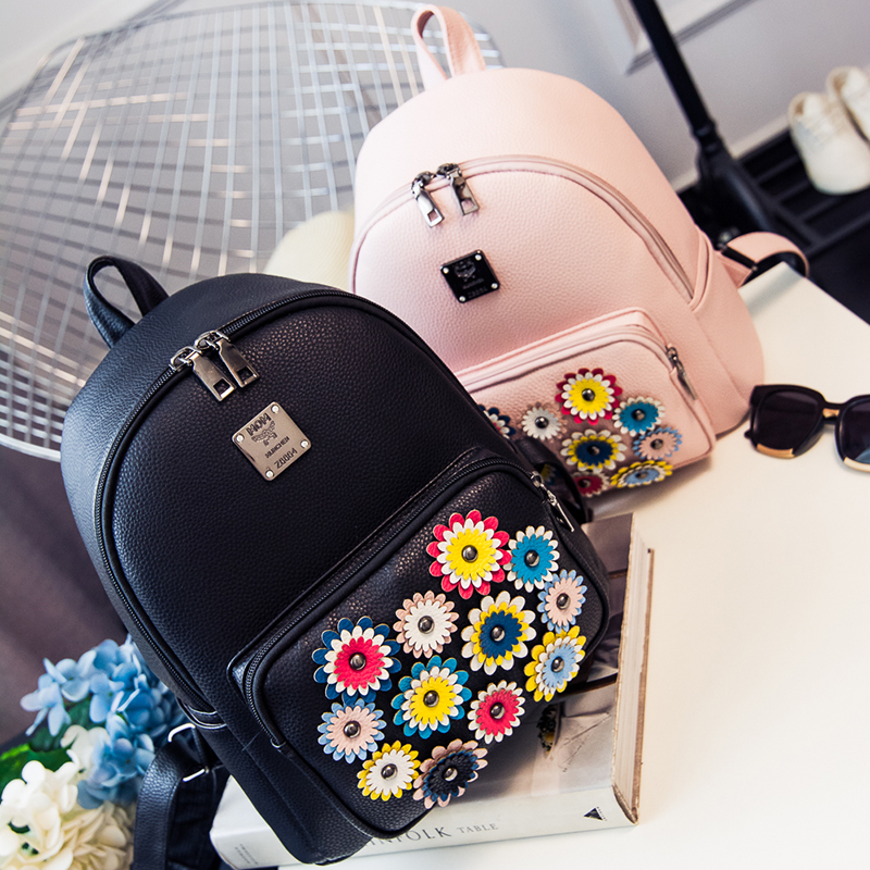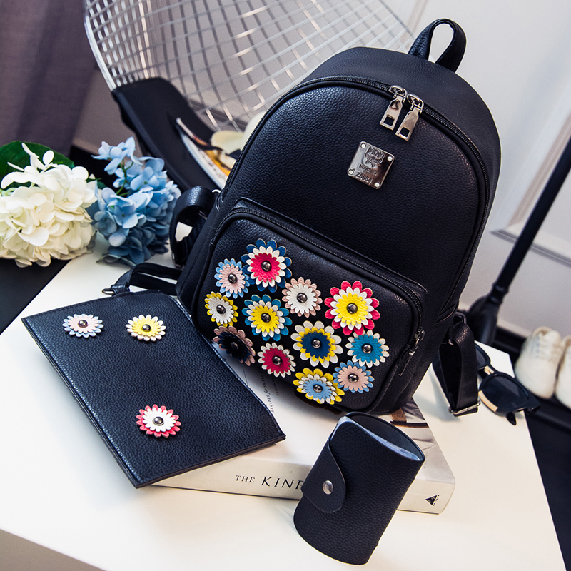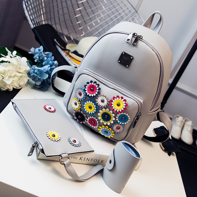 日韓女孩子三件套雙肩包女童學生書包花朵旅游背包小學生書包潮包