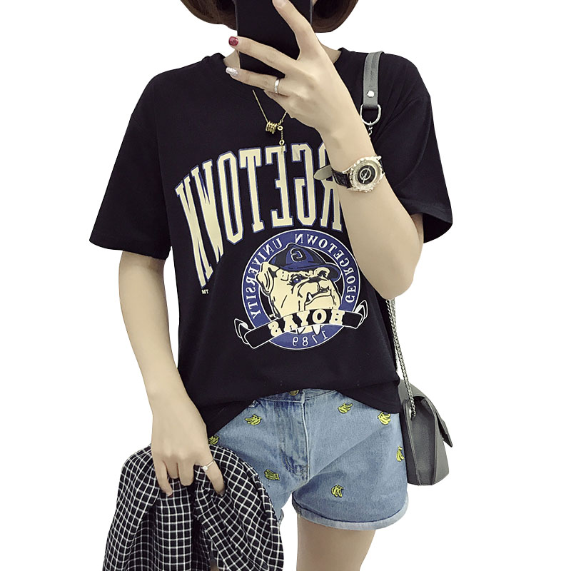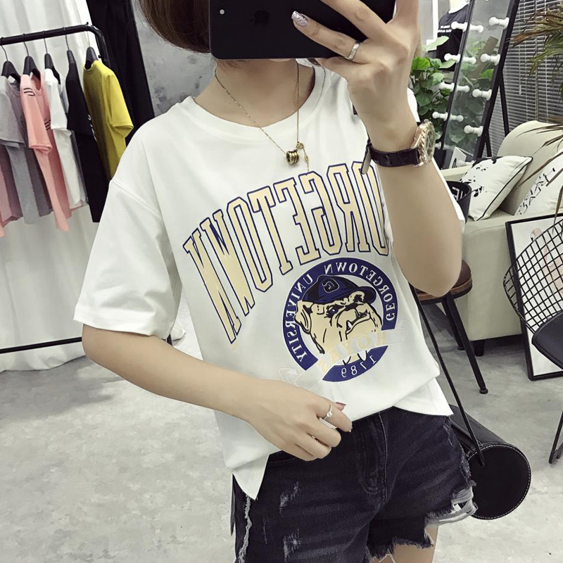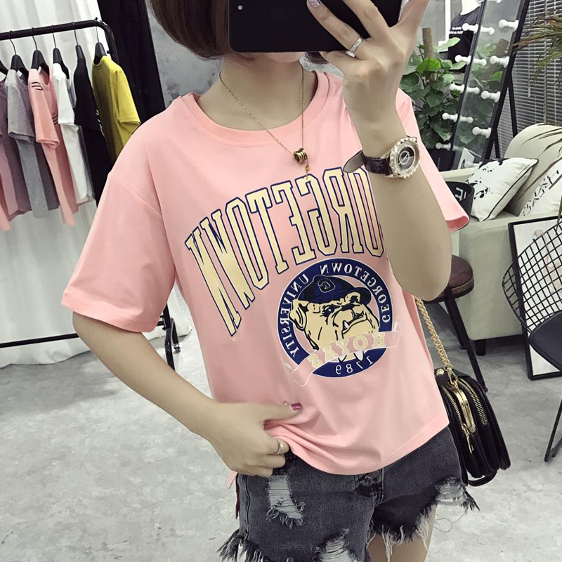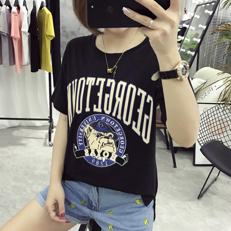 / 卡通T恤女裝大碼休閑上衣新款學生韓版圓領短袖前短后長體恤