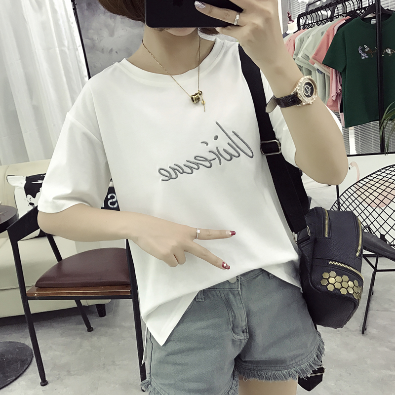 夏裝寬松新款刺繡t恤女簡約閨蜜裝短袖女上衣顯瘦韓版潮體恤