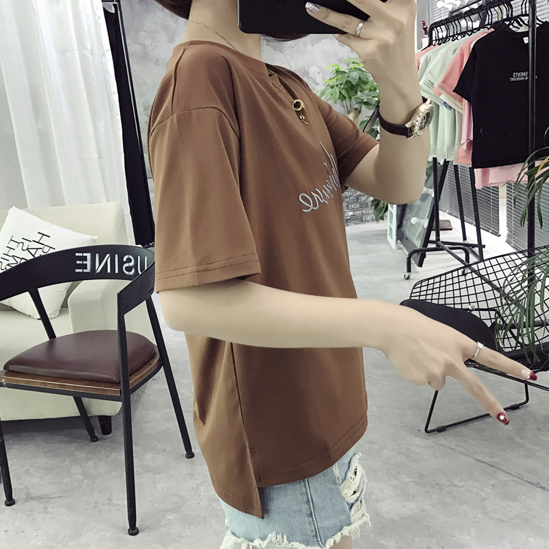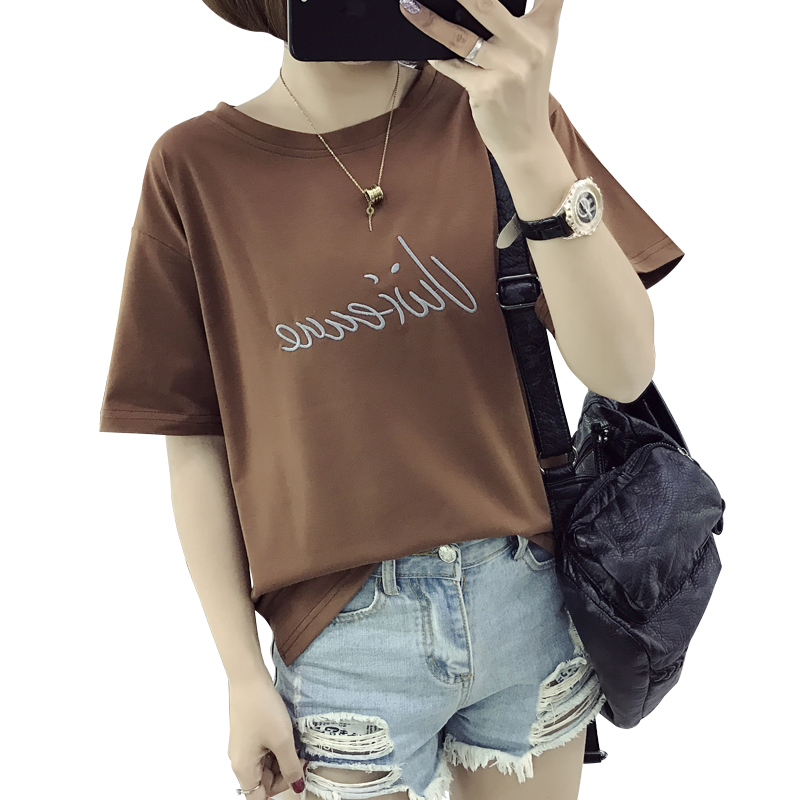 / 夏裝寬松新款刺繡t恤女簡約閨蜜裝短袖女上衣顯瘦韓版潮體恤
