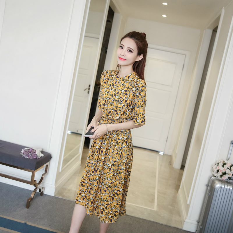夏季新款女裝復古印花短袖中長款裙子收腰顯瘦碎花雪紡連衣裙