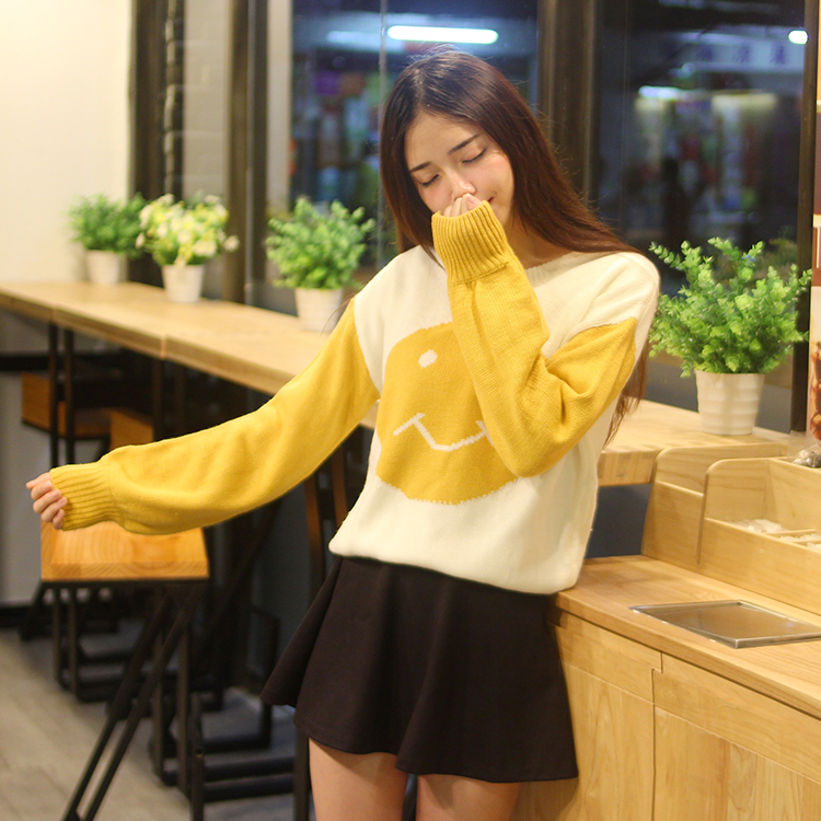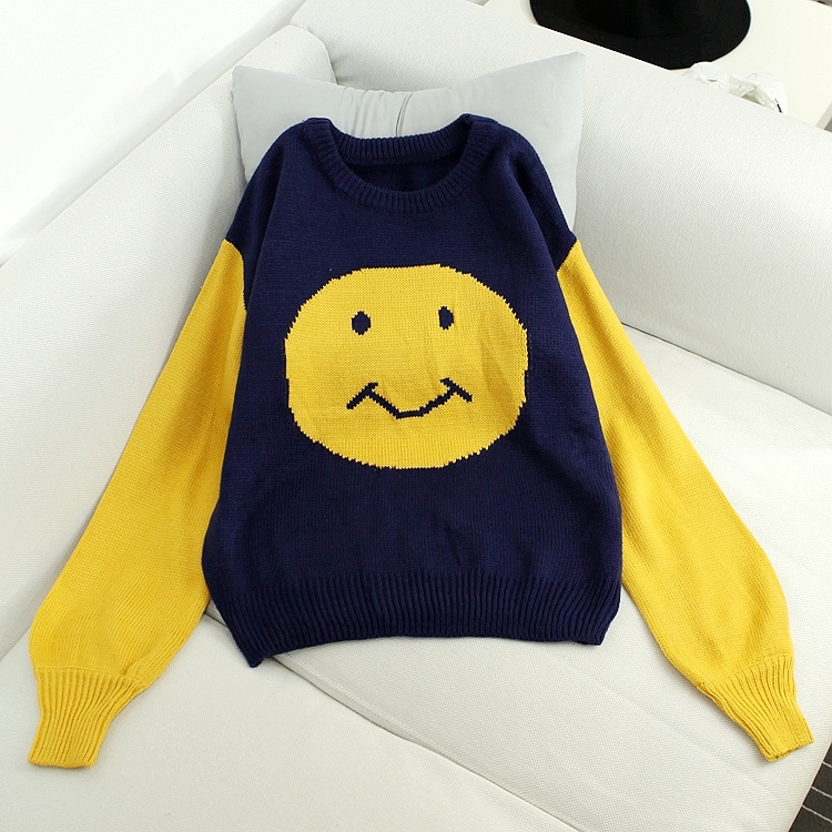 韓國原宿風秋冬款可愛笑臉撞色套頭學生長袖粗棒針毛線毛衣女