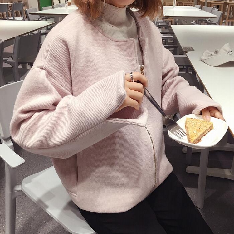 / 秋冬款韓國chic風寬松圓領長袖開叉圓環拉鏈開衫純色短外套女