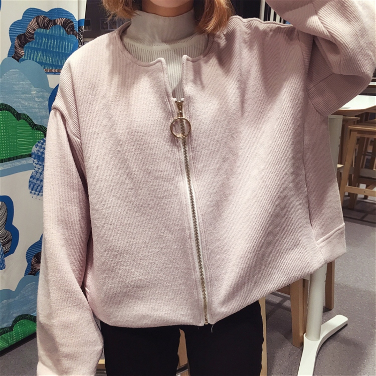 秋冬款韓國chic風寬松圓領長袖開叉圓環拉鏈開衫純色短外套女