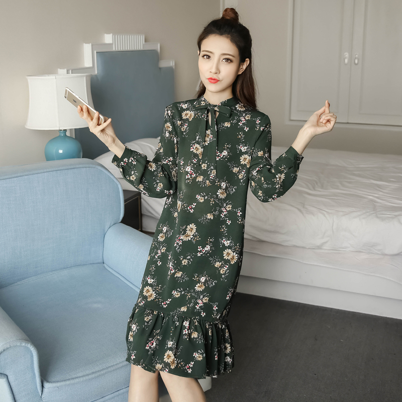 / 春新款女裝復古印花中長款魚尾裙顯瘦碎花雪紡長袖連衣裙春秋