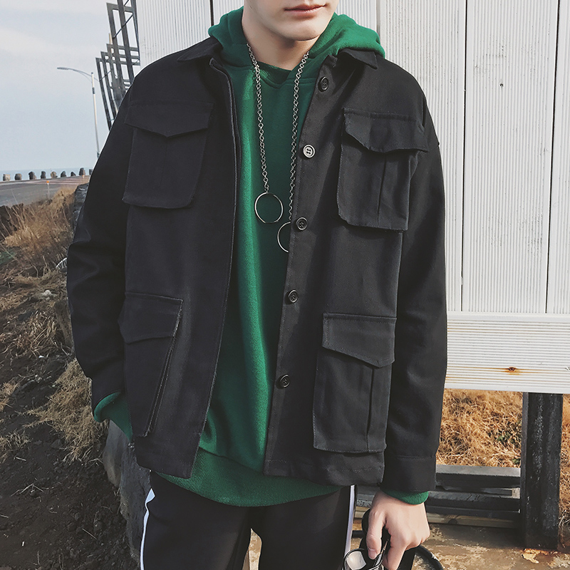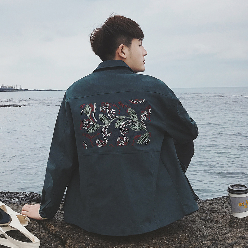 男裝刺繡植物樹葉韓版春季男士翻領寬松夾克外套