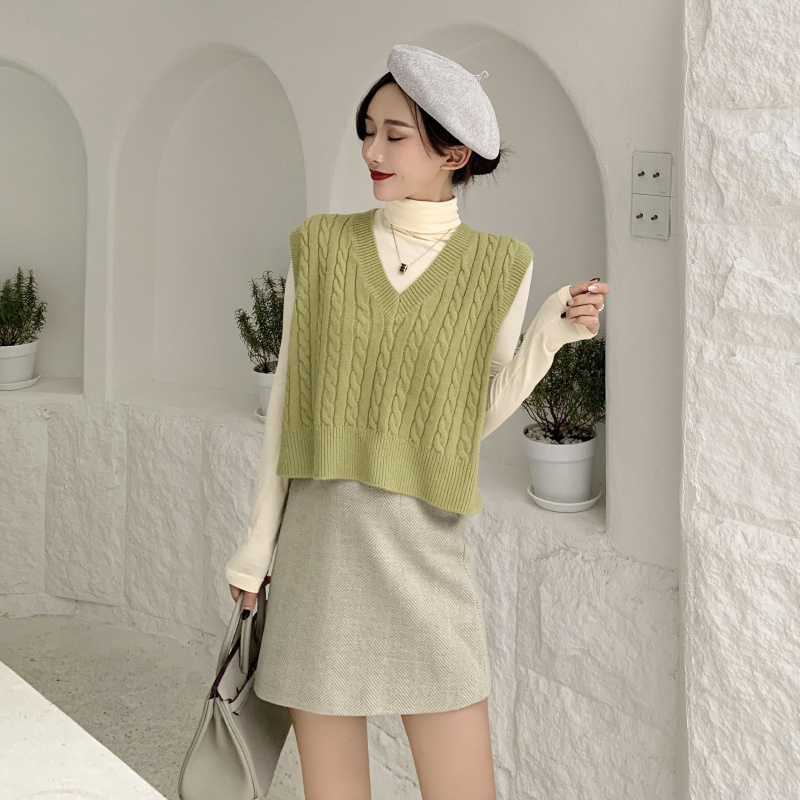 綠色馬甲|杏色打底衫|毛呢半身裙