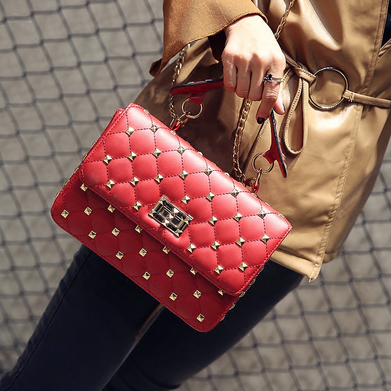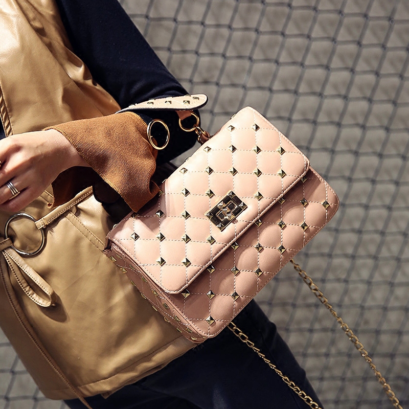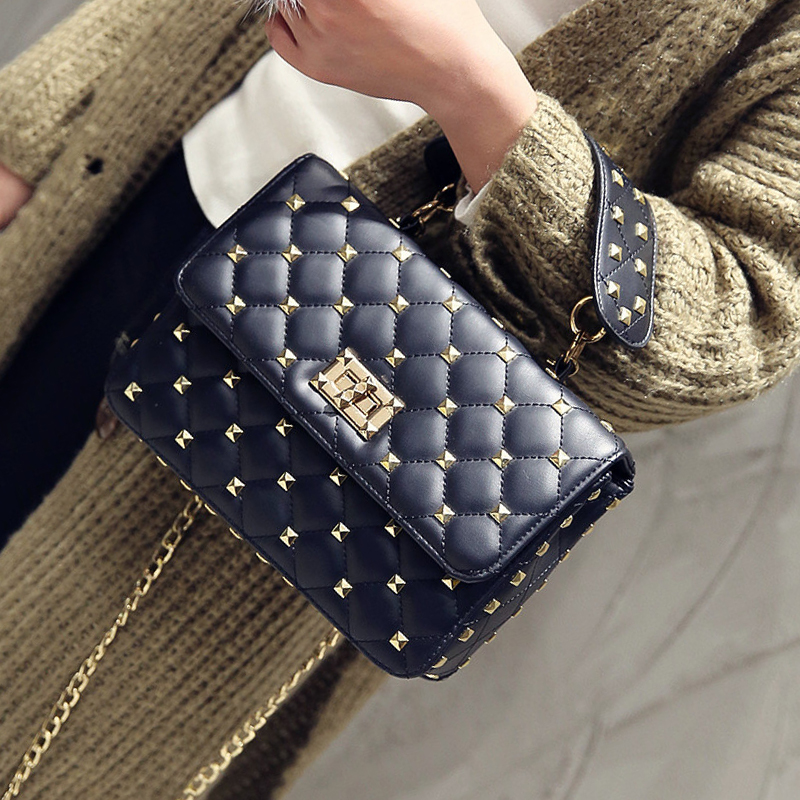 / 鏈條包包女新款潮菱格鉚釘小方包韓版單肩手提包迷你斜挎小包