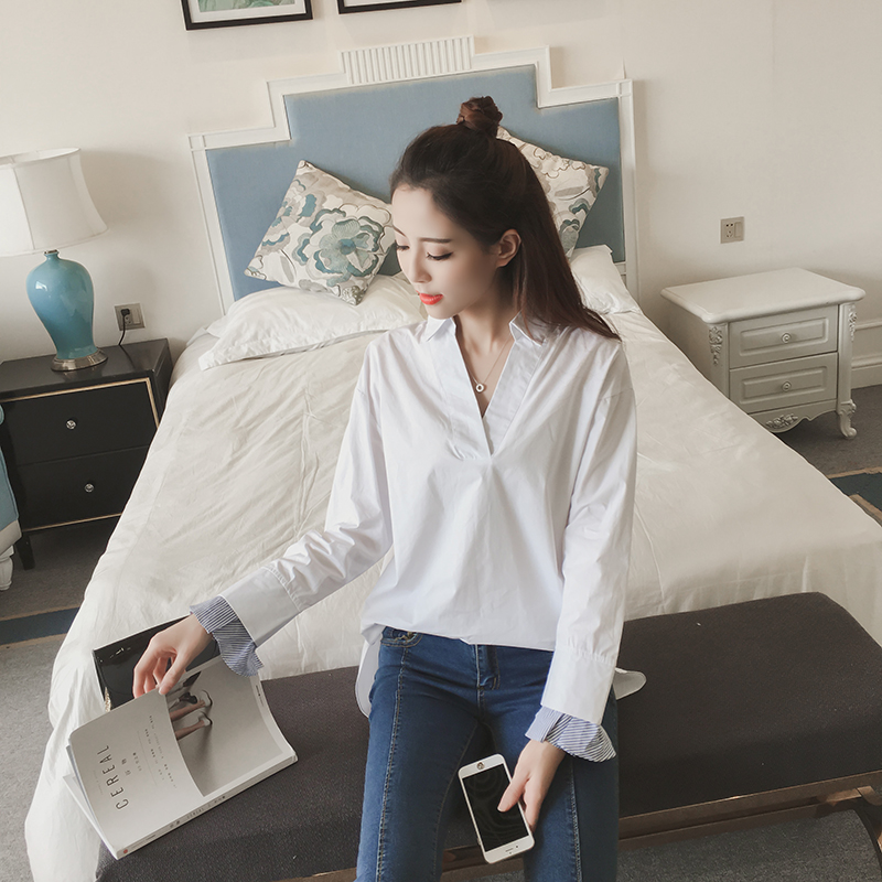 / 春款女裝喇叭袖拼接條紋襯衫女韓范長袖雪紡百搭襯衣v領上衣