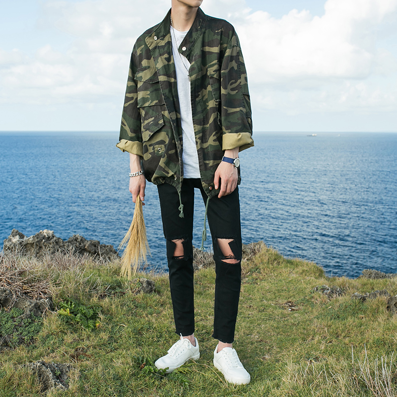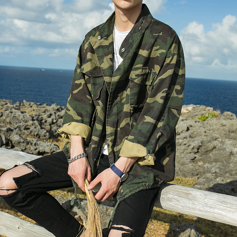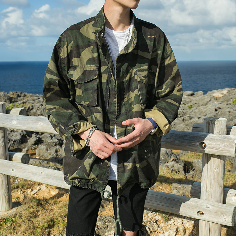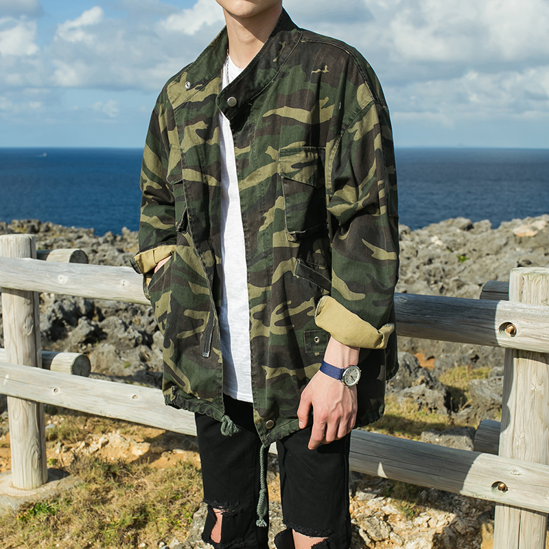 / 男裝迷彩印花單排扣寬松外套男士春裝立領軍綠夾克