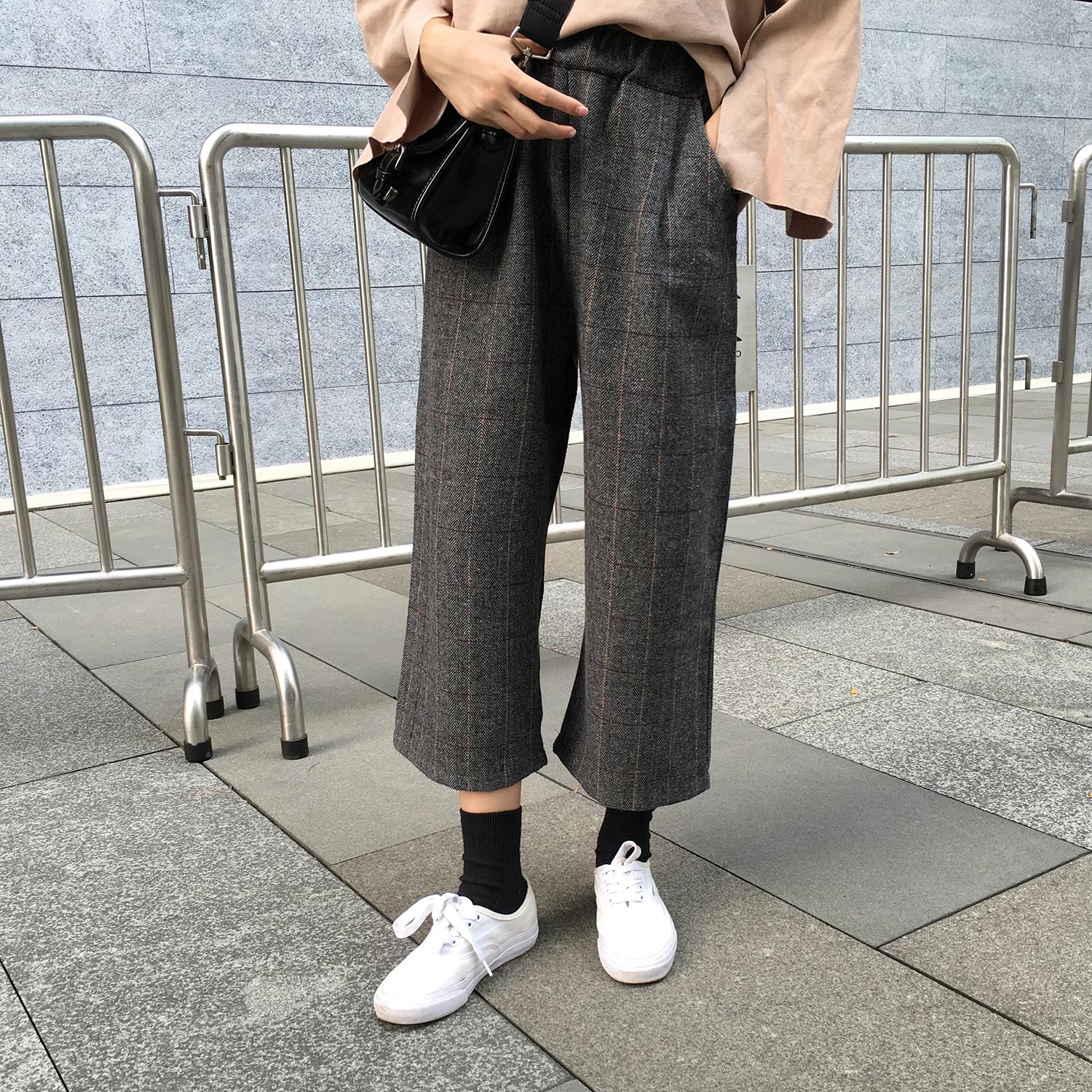 韓國chic冬款寬松格子闊腿褲百搭顯瘦呢子九分褲直筒休閑褲女