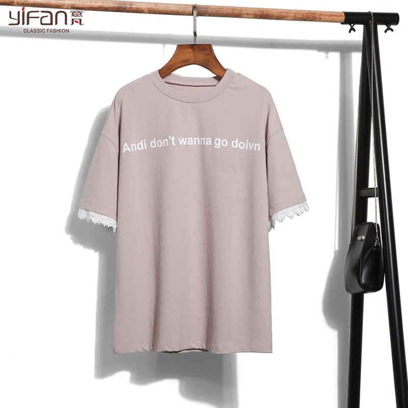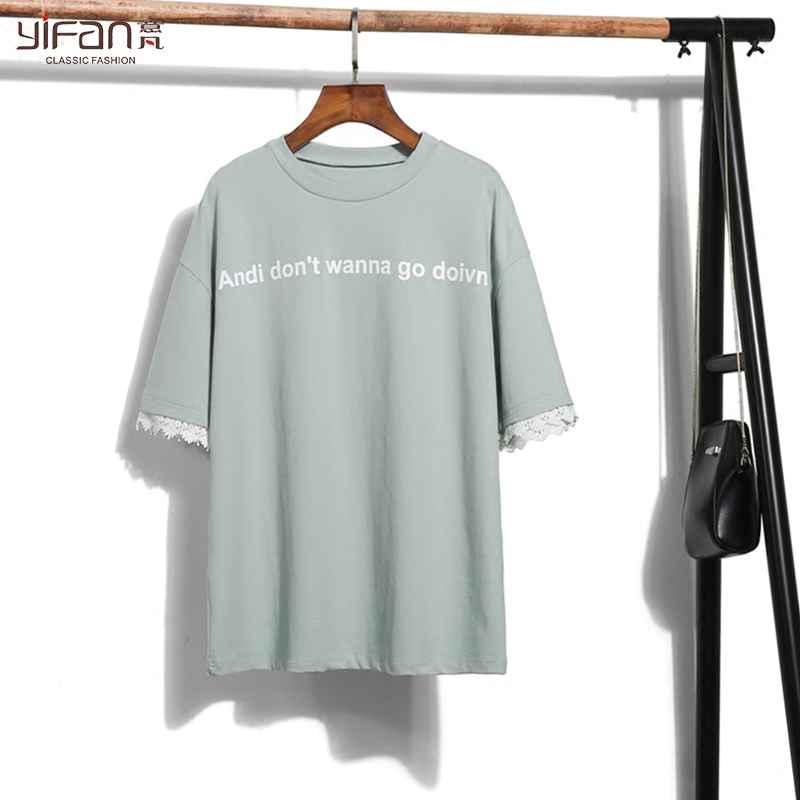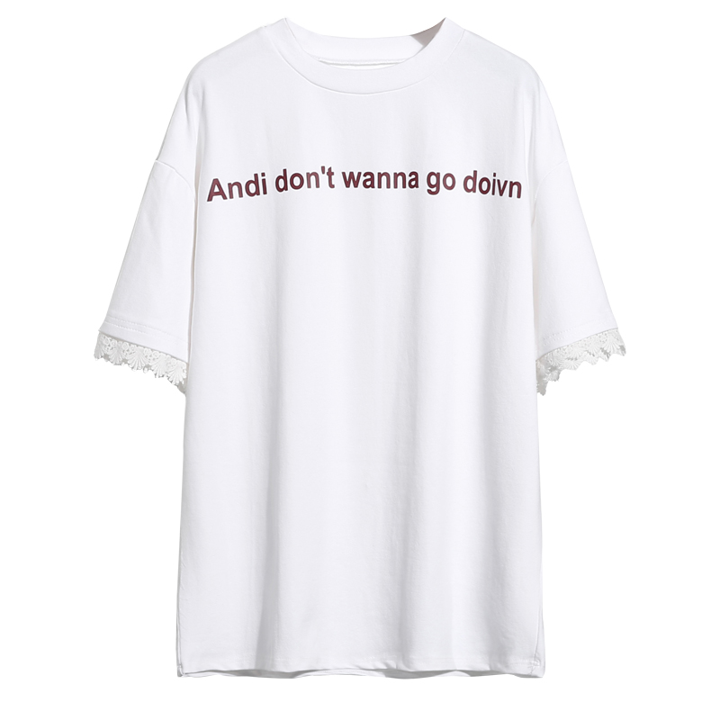 / 夏季韓國風字母印花學生百搭寬松圓領袖口花邊短袖T恤女裝打底衫