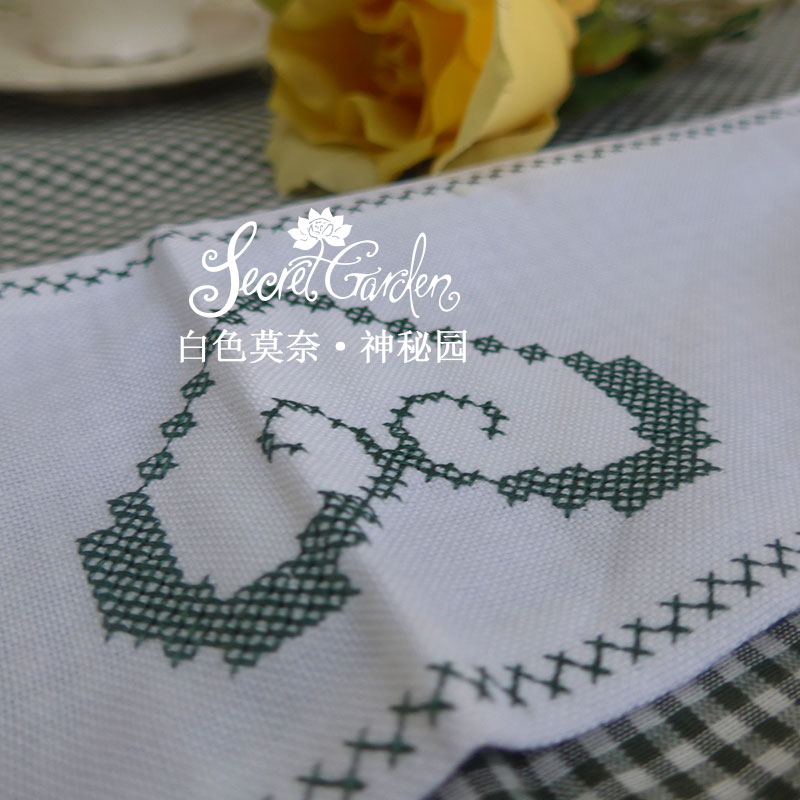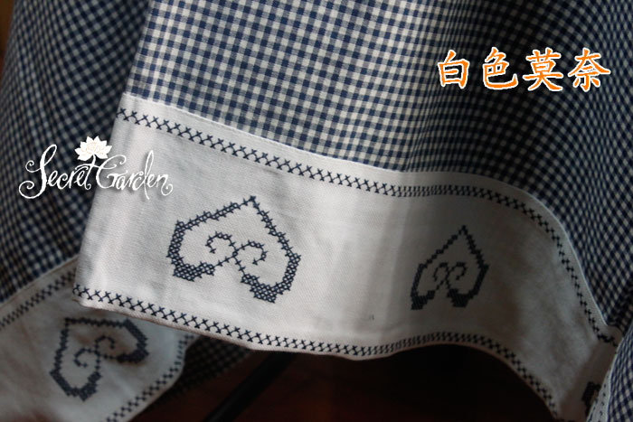 關于她:難得的鄉村風格精致設計,面料為密實的色織格子,環保不掉色,出彩的是包邊,白色底上點綴一串純手工十字繡花桃心,斜角收邊遠比一般的普通折邊更加講究,推薦收藏。