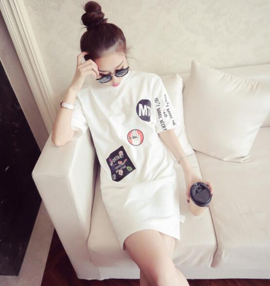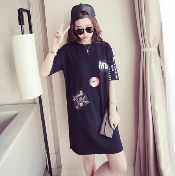/ 2017夏季新款學院風字母印花中長款t恤寬松顯瘦小清新黑色連衣裙