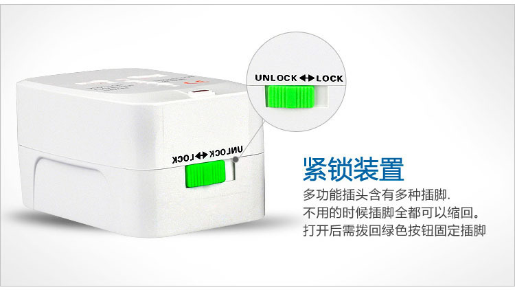 1、把要使用的(對應國家)插頭彈出(開關置于UNLOCK位置),彈出后再把開關置于LOCK位置鎖住。