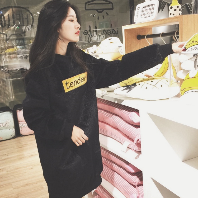 冬款韓版中長款長袖加絨寬松休閑圓領套頭上衣字母刺繡衛衣女