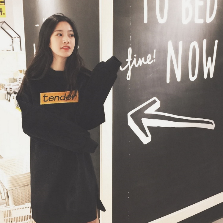 / 冬款韓版中長款長袖加絨寬松休閑圓領套頭上衣字母刺繡衛衣女