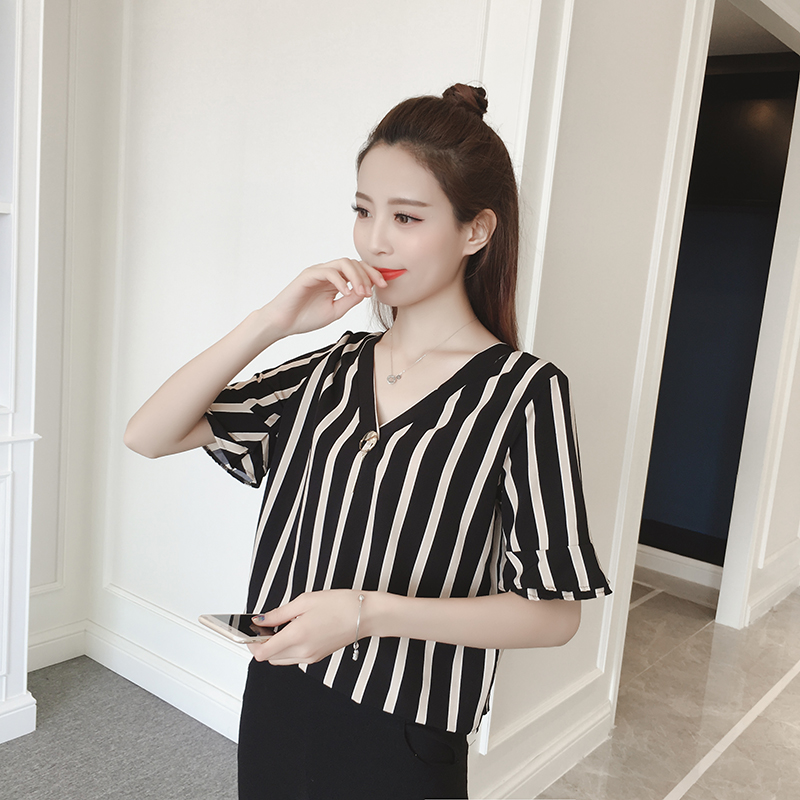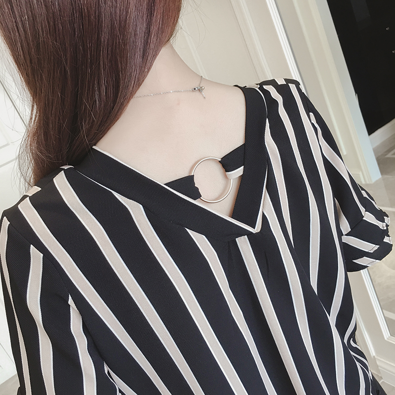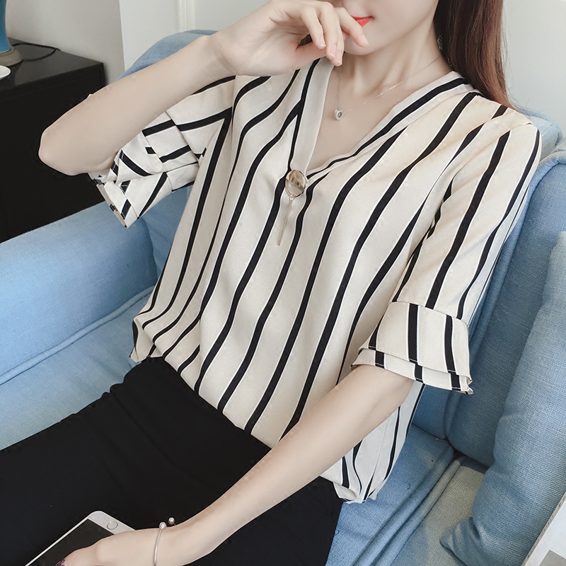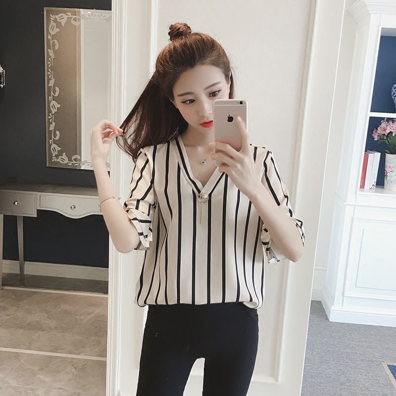 / 春夏裝新款女裝豎條紋襯衫女顯瘦百搭中袖V領上衣韓版襯衣潮