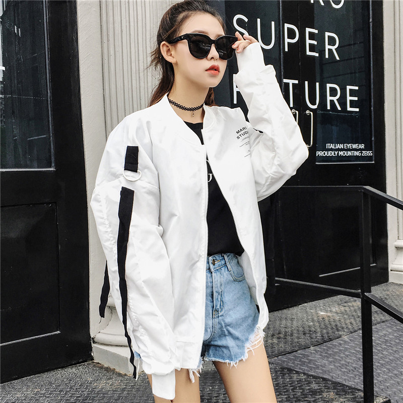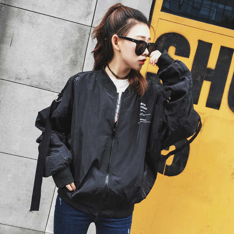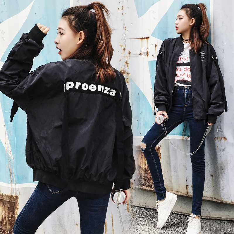 秋款外套女2017新款長袖百搭寬松韓版學生BF原宿風純色飄帶棒球服