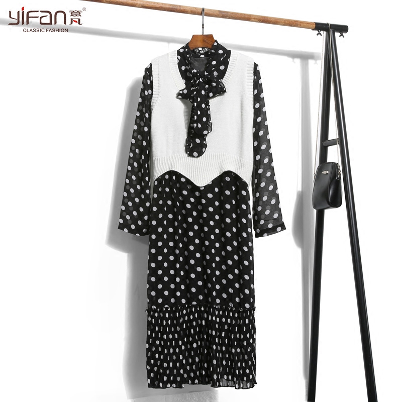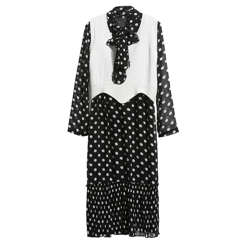 春夏雪紡波點長袖連衣裙韓版新款蝴蝶結領打底寬松沙灘裙