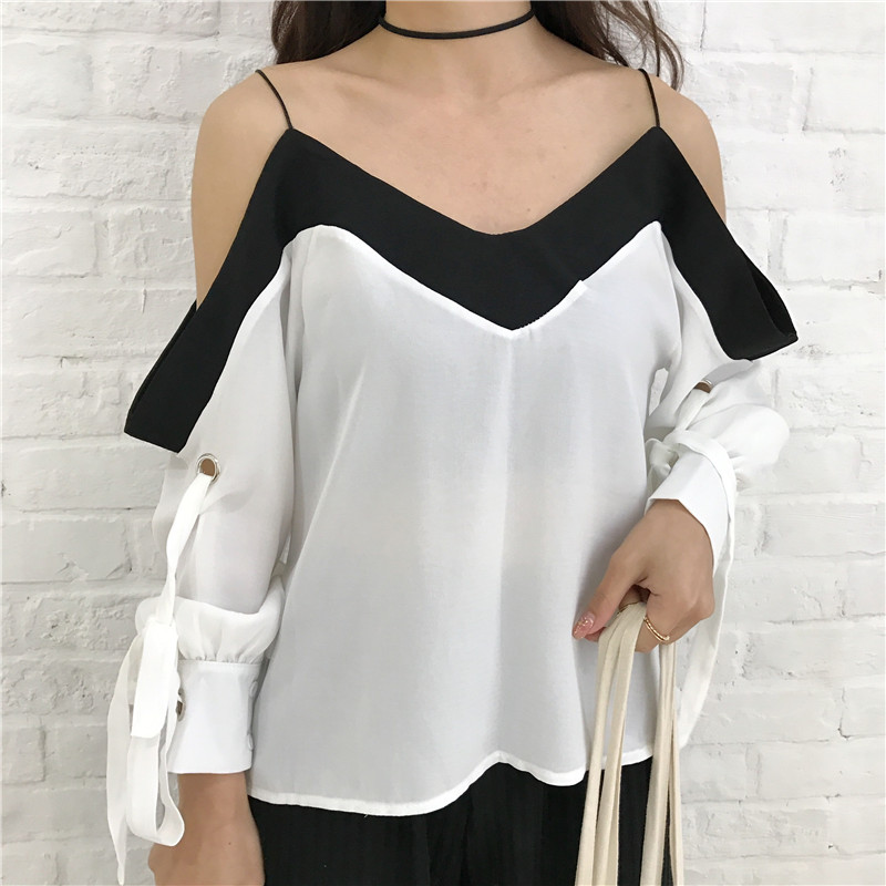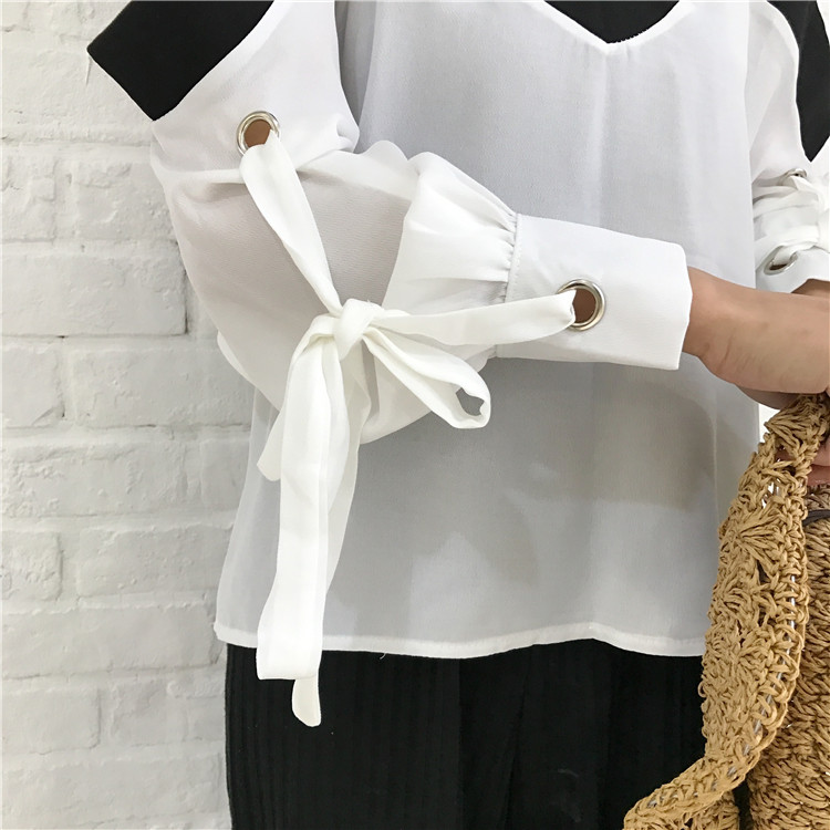 / 夏季V領交叉綁帶露肩雪紡衫 流蘇蕾絲邊系帶褶皺吊帶喇叭袖上衣