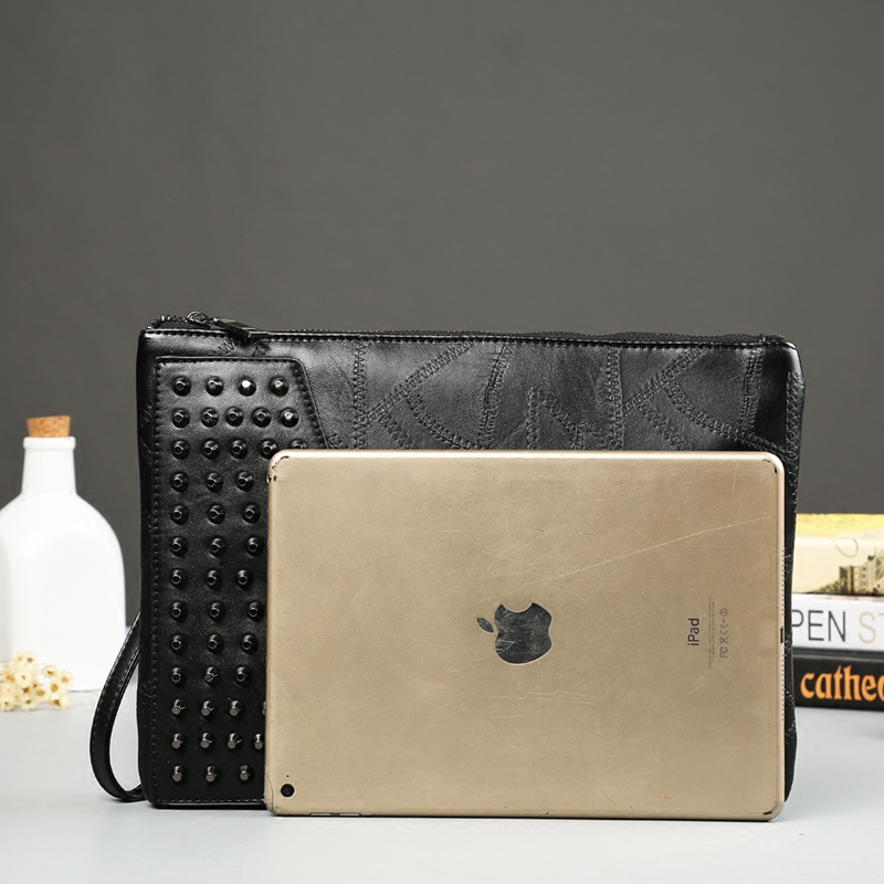 / 韓版軟皮鉚釘手拿包新款男女士手抓包信封包單肩斜跨包潮流男包