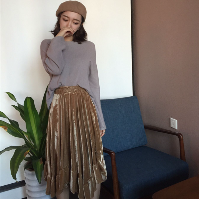 / 秋冬韓國厚實絲絨高腰松緊中長款不規則荷葉邊半身裙大擺裙女