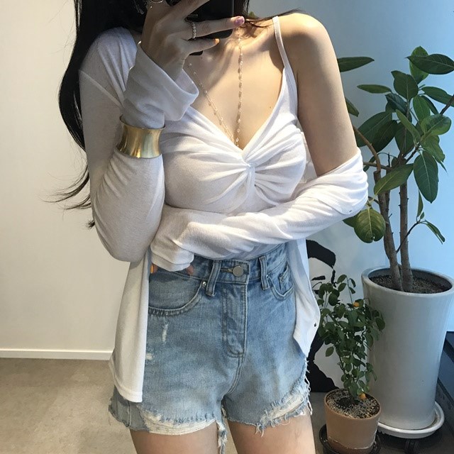 / 韓國東大門新款交叉打結小吊帶修身薄款針織衫防曬開衫外搭兩件套